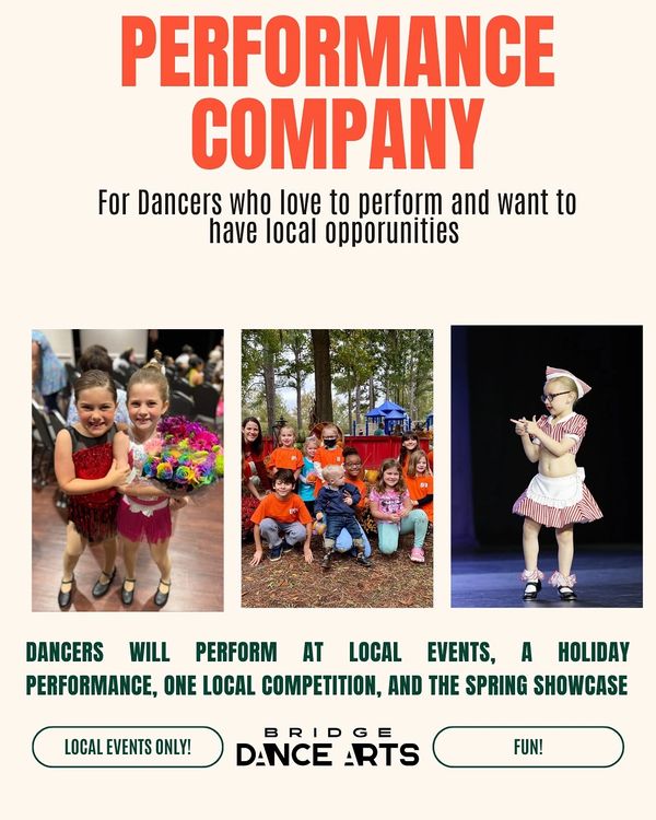 The Performance Company is a local performing team for ages 4 and up that will attend community events, perform in a holiday performance, as well as attend one local competition.