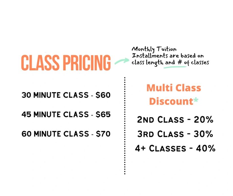 Tuition is an annual fee that is paid in installments based on the total number of classes. It is divided into equal payments so that the amount is consistent regardless of the number of classes per month. All planned closures (holidays, inclement weather etc.) are already factored into your tuition and will not change your monthly payments.